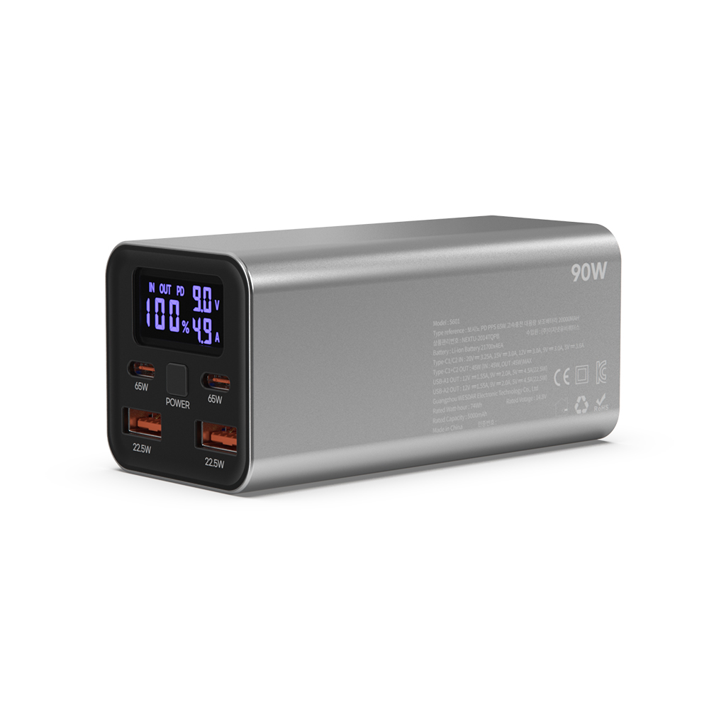 20000mAh QC3.0/PD 65W 휴대용 보조배터리 / 단독 Input(USB-C1, C2) 5V/3.6A,9-15V/3A, 20V 3.25A 최대65W / 듀얼 Input (USB-C1+C2 ) 45W+45W = 최대90W /단독 Output(USB-C1, C2) 5V/3.6A, 9-15V/3A, 20V/3.25A PD 65W 출력 , (USB-A1,A2) 5V/4.5A , 9V/3A , 12V/3A 최대 22.5W /NEXTU
