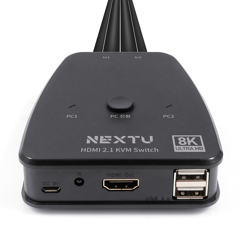 UHD 8K 2포트 HDMI KVM 스위치( 케이블 일체형)/선택방법: 전면 셀렉버튼,유선키패드(1.5M), 무선 IR 리모컨 / 8K60Hz / 4K 60Hz. 4K 120Hz 지원/HDCP지원/HDR/무전원 지원/ USB 5V 전원공급포트 지원