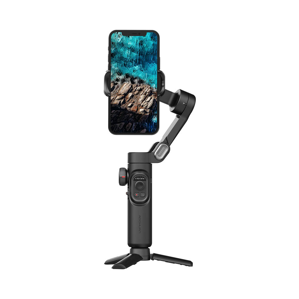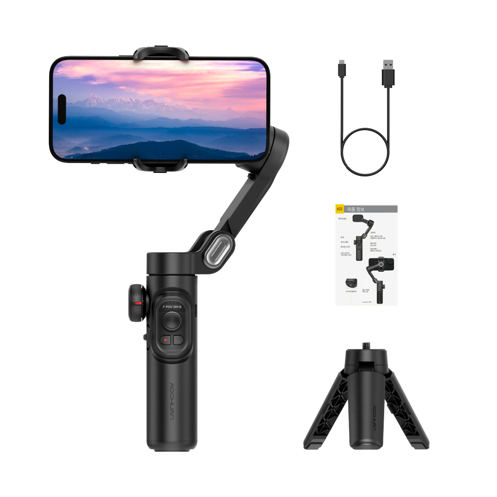 강력한 3축 접이식 스마트폰 짐벌 / 삼각대 포함 / 아이폰·안드로이드폰 호환 / 브이로그·라이브·셀카·스포츠 촬영 지원 / 가로-세로 원터치 전환 / 350g 경량, 250g 지탱 / 초점 휠·줌 슬라이드 / 2600mAh 배터리로 최대 10시간 사용 / AI 얼굴 추적·앱 제어·7.0 안티쉐이크 / 1/4 나사로 액세서리 연결