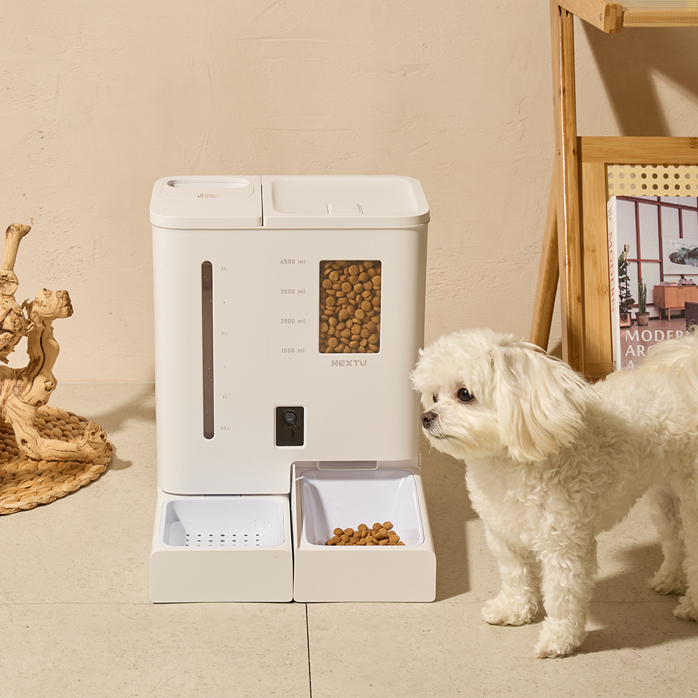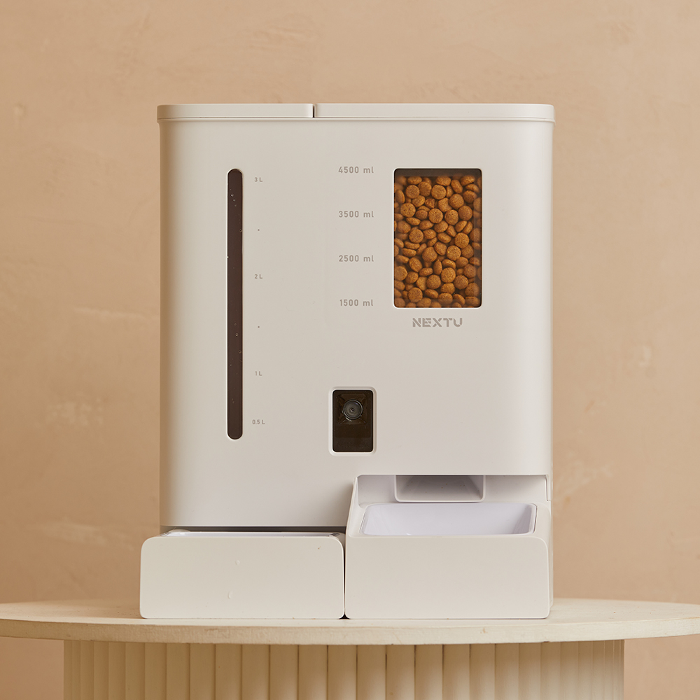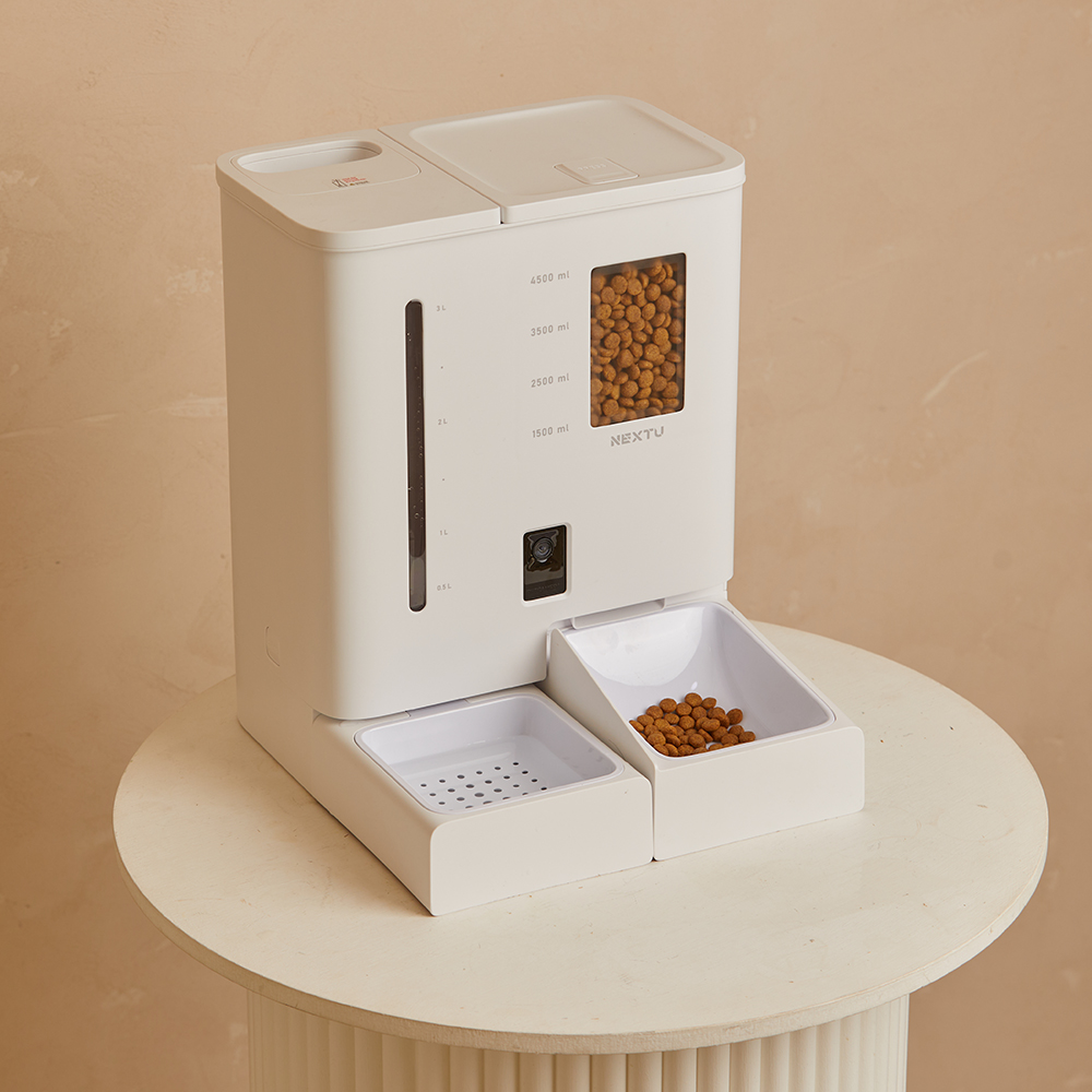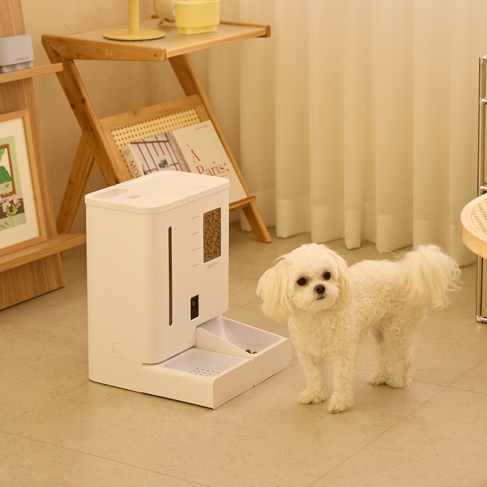 반려동물 올인원 스마트 자동급식기 급수기 / 듀얼 분리형 저장공간(사료 5L, 물탱크 4L) / 스마트폰 APP 원격 제어 및 실시간 카메라 모니터링 / 타이밍 피딩(정해진 시간에 자동 배식) / 앱을 통한 주인의 음성 스피커 기능 / 투명 사료 트레이로 내용물 확인 가능 / 식품 등급 멜라민 수지 및 ABS 소재 사용 무독성 식기 / 반려견, 반려묘