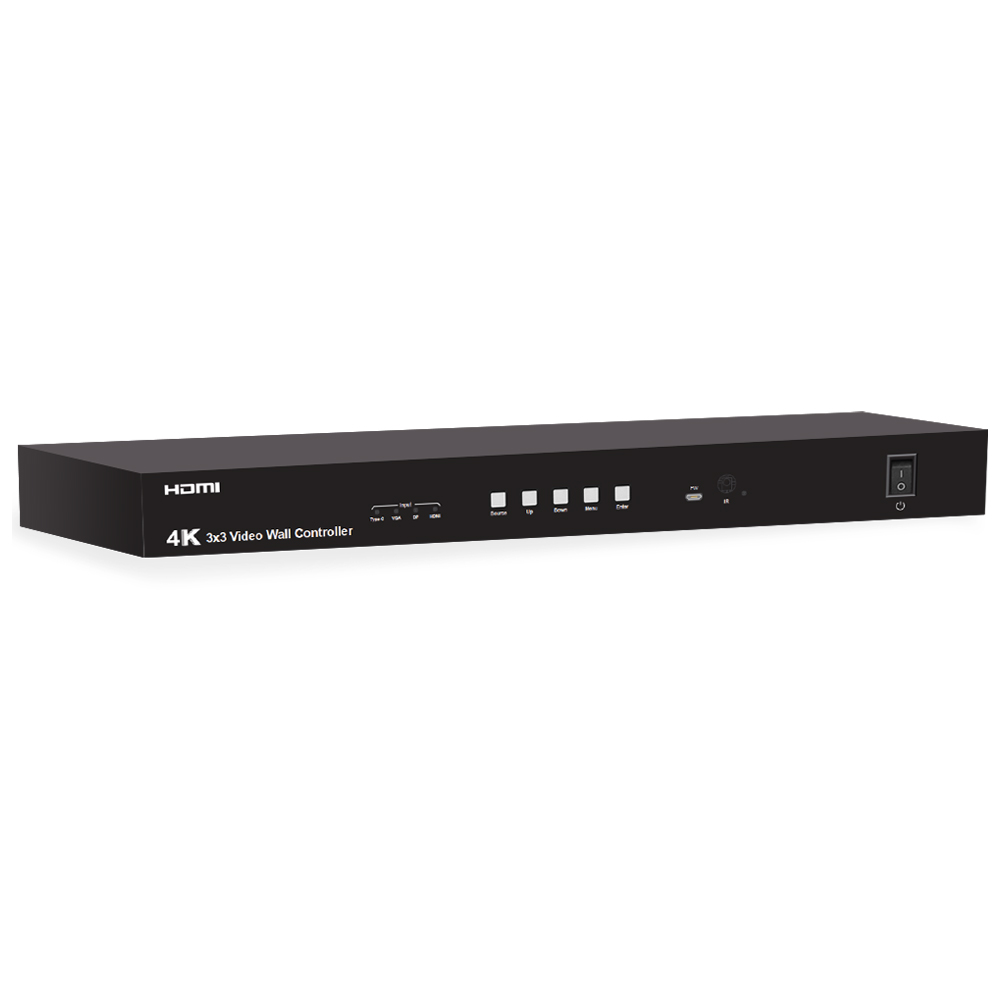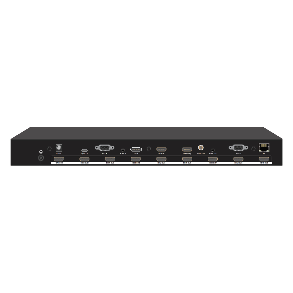 NEXT-3319VW, 1x9 HDMI1.4 비디오월 컨트롤러 /4K30Hz /INPUT지원(USB-C, VGA , DP , HDMI) /캐스케이드 (최대10X10)/광(COAXIAL) out x1, 아날로그(AUX) out x1 /EDID 수동설정(LCD) / HDCP v1.4 /IR리모컨 /5.1ch /콘솔(RS232/LAN) /19인치