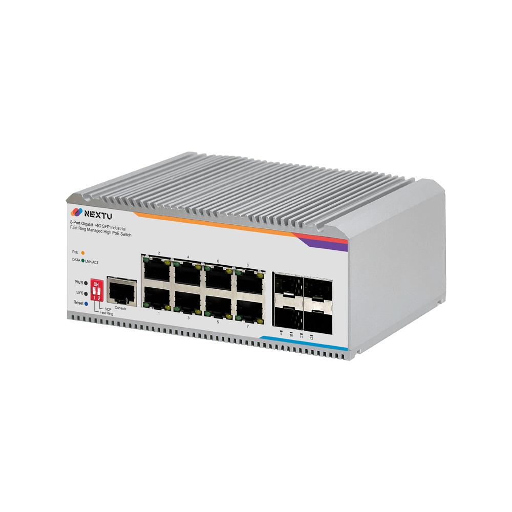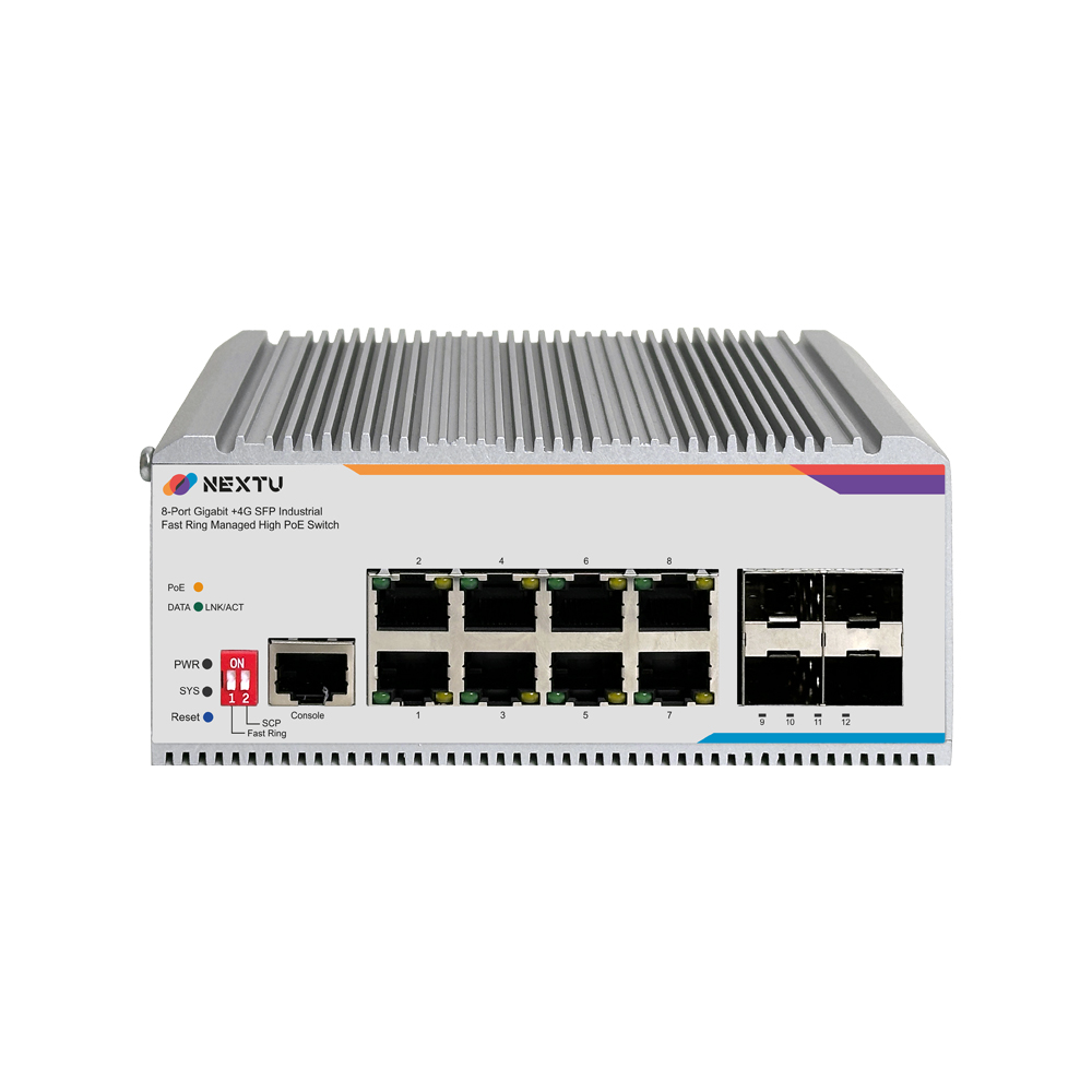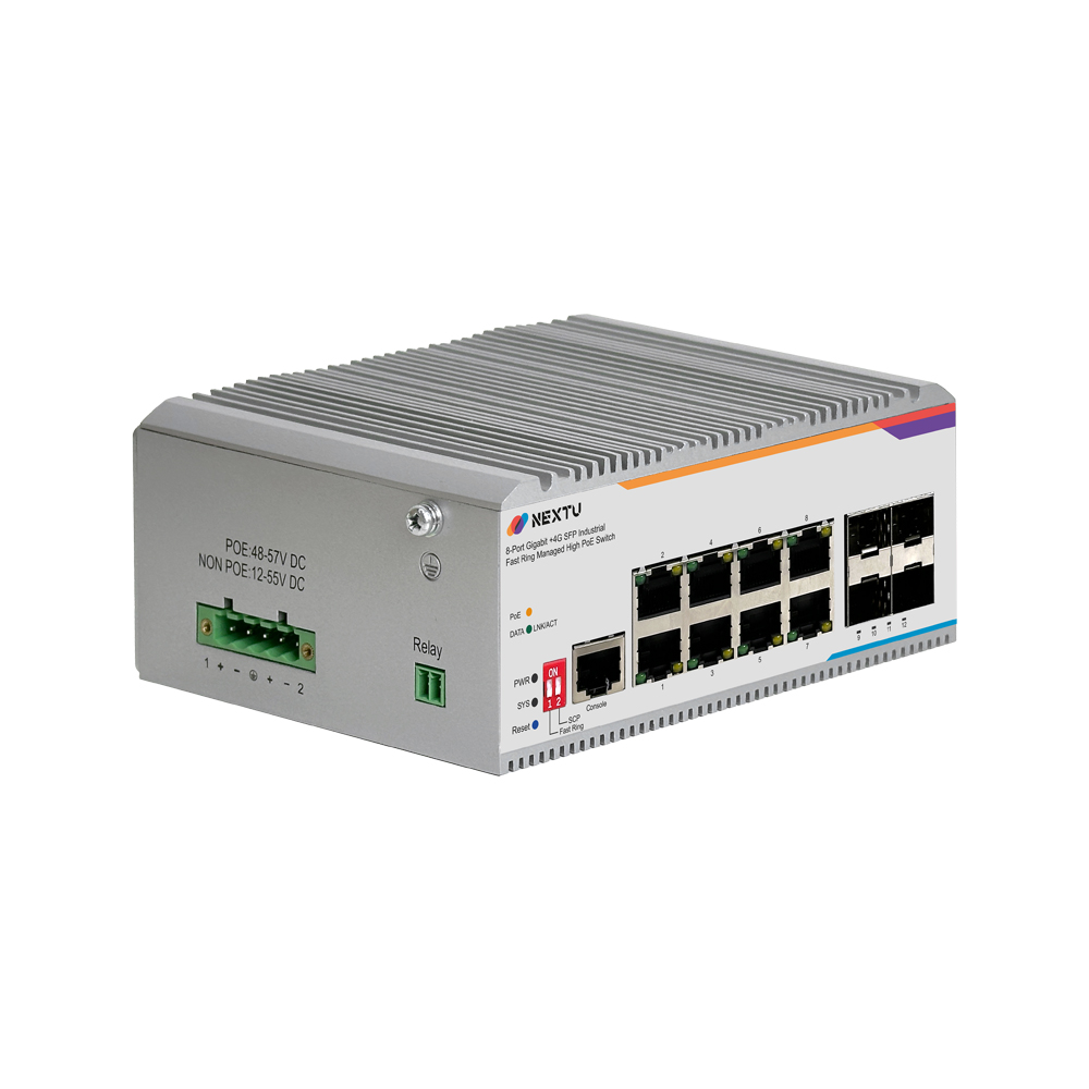 산업용 100M/1GX 4SFP + GbE 8TP Fiber Switch / 산업용 L2 매니지드/딥스위치(FAST RING, SCP) 링지원/ RSTP,ERPS,QOS,IGMP,ALC,VLAN,LACP 프로토콜 지원/ 듀얼 DC INPUT 48~57V DC/ 802.3bt 포트당 최대 90W POE / 총용량 480W / RJ45 x 8EA, SFP x 4EA , POE9748MDTL2